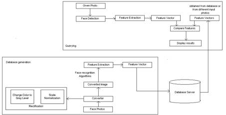 The second system mainly involves querying and retrieval phase. The face in the given photo should be identified, normalized and be represented in Gray Scale in order to extract its features. After the features of the photo are extracted, they are compared with all of the feature vectors that are stored in the database. The faces which have the most similar feature vectors with the given face are displayed.