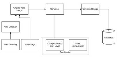 Before starting the project, a database needs to be constructed well to be able to get logical subsets for comparing faces. There are a few steps during database construction for collecting meaningful data that will be used for face recognition. As it can be seen from Figure.2, original face images are gathered from various sources over Internet. After that a converter performs different processes in order to standardize face images. All of these processes are called rectification. Converted images are transformed into features vector that are recorded in the database.