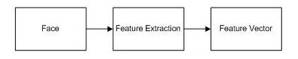 For image processing, feature extraction needs to be performed since face recognition algorithms need less data but more information rather than a raw image. Therefore images are processed in order to get more information from data set. As it can be seen from Figure.3, input data is transformed into set of features (also known as features vector) and this process is called feature extraction.