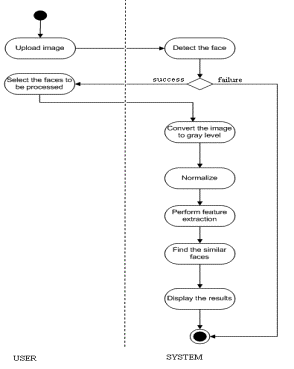 One of the requirements that the application should satisfy is to find similar faces in the database to a given face. In order to use the system, the users either upload an image or type a name to find an image. As indicated in the database construction section, the names of the people in the images are hold in the database. If the user types a name, the matching images with that name, if there is any, are brought to the user and the user selects the image to be processed among them. After upload or selection of the image, the system starts to detect the faces in the image. Then, the user is asked to select the faces which will be processed among the detected faces. The system performs a feature extraction on the image in order to retrieve corresponding images in the database. When the system gets the most similar faces to the given ones, they are presented to the user in the order of similarity percentage.
