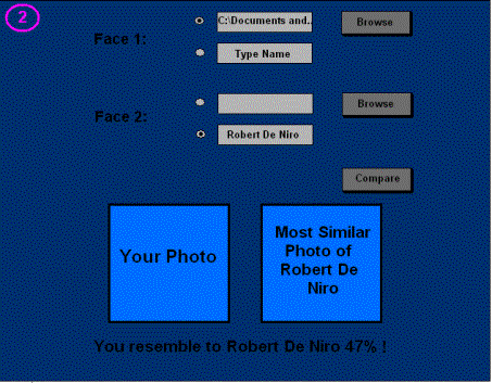 á Ali wants to see how much he resembles to Robert de Niro. He logs in to his account. He chooses the ÒCompare facesÓ option from the menu. He uploads his picture using the ÒBrowseÓ button. Afterwards, he types ÒRobert de NiroÓ to the text field. He presses the ÒGo!Ó button. He can see status information while the system analyses the photos. The system compares the given picture with photos of Robert De Niro located in the database. The system displays the photo of Robert de Niro that Ali looks most alike. When the comparing process is done, the results are displayed below AliÕs photo. Next to Robert de NiroÕs photo (which is found from the database) %23 which is the percentage of similarity is shown.