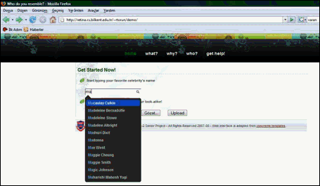 The user may choose to get results for his personal photos or for celebrities. If the user wants to find to whom a specific celebrity resembles, he can either directly upload a picture of him by using the browse button, or he can choose to type the name of the celebrity in the textbox. As the user types, the textbox shows the options he has (since the programs uses the pictures in the database when “search by text” is used by the user). The user either types the whole name or chooses the name he wants from the list. This step is shown in Figure.B-2.