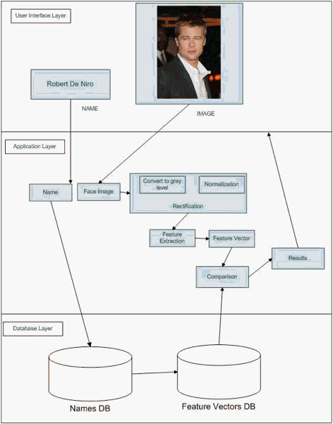 As described above in current system part, a web crawler has been designed which is focused on My Heritage’s raw images of celebrities. A few photos of each celebrity are needed for a better and robust result set. The web crawler is designed for getting images from My Heritage’s website at this stage; however, it will be a general-purpose crawler for future usage. It is planned to crawl also news with images and will get title, summary and image of the news from various news sources over Internet. Therefore, textual descriptions could be used while relating different faces among pictures. Web crawler is going to work during project development and database will be extended; therefore it gives a chance for maintaining an up-to-date database. During web crawling process, there will not be any face detection or elimination for raw images. So it will work the same way as general-purpose image crawlers. Additionally this web crawler will able to find the image by the given name if that person’s image does not take place in our database. By this way usability of the system increases as well as it helps to enlarge the database with the required data by the user. More over, the web crawler will be able to add new images to the database depending on the search results of the users of the system. For example, web crawler can add more pictures to the database depending on the items that most frequently searched by the users. Finally web crawler will be used in order to update the database for some period of time.